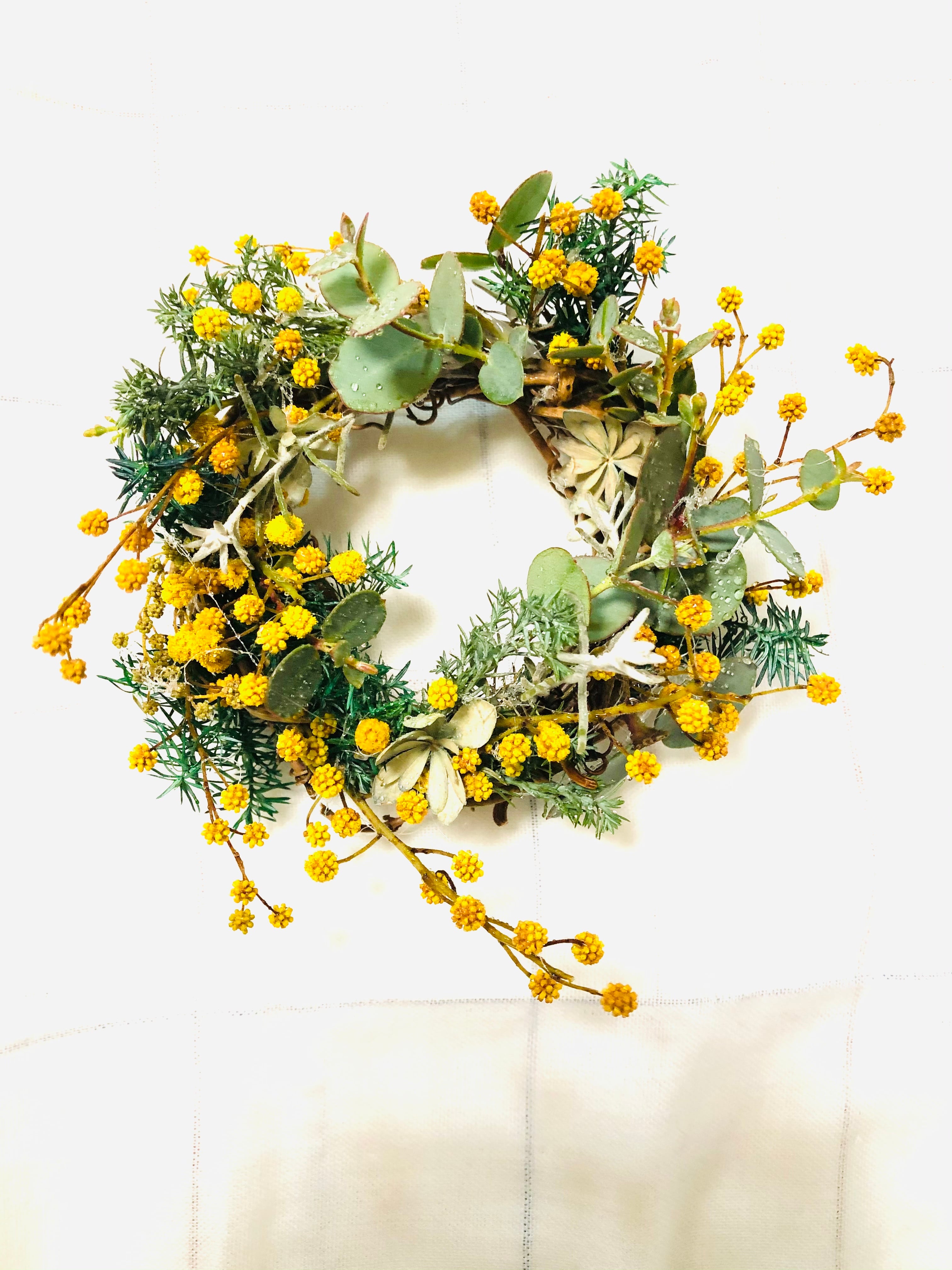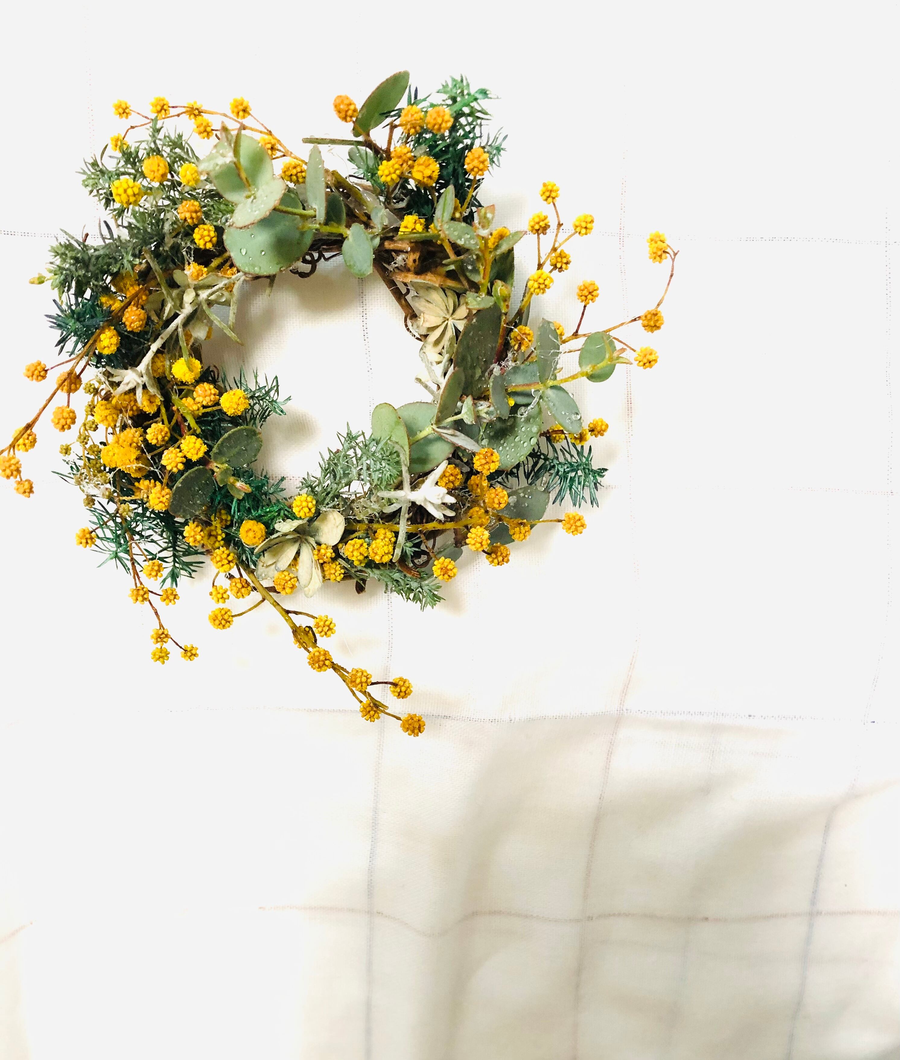 ミモザドライとプリザーブドヒムロスギやユーカリ、エレモフィラなど数種類のグリーンとアジサイドライをあしらいました。野原でつくったwreatheのようなイメージです。