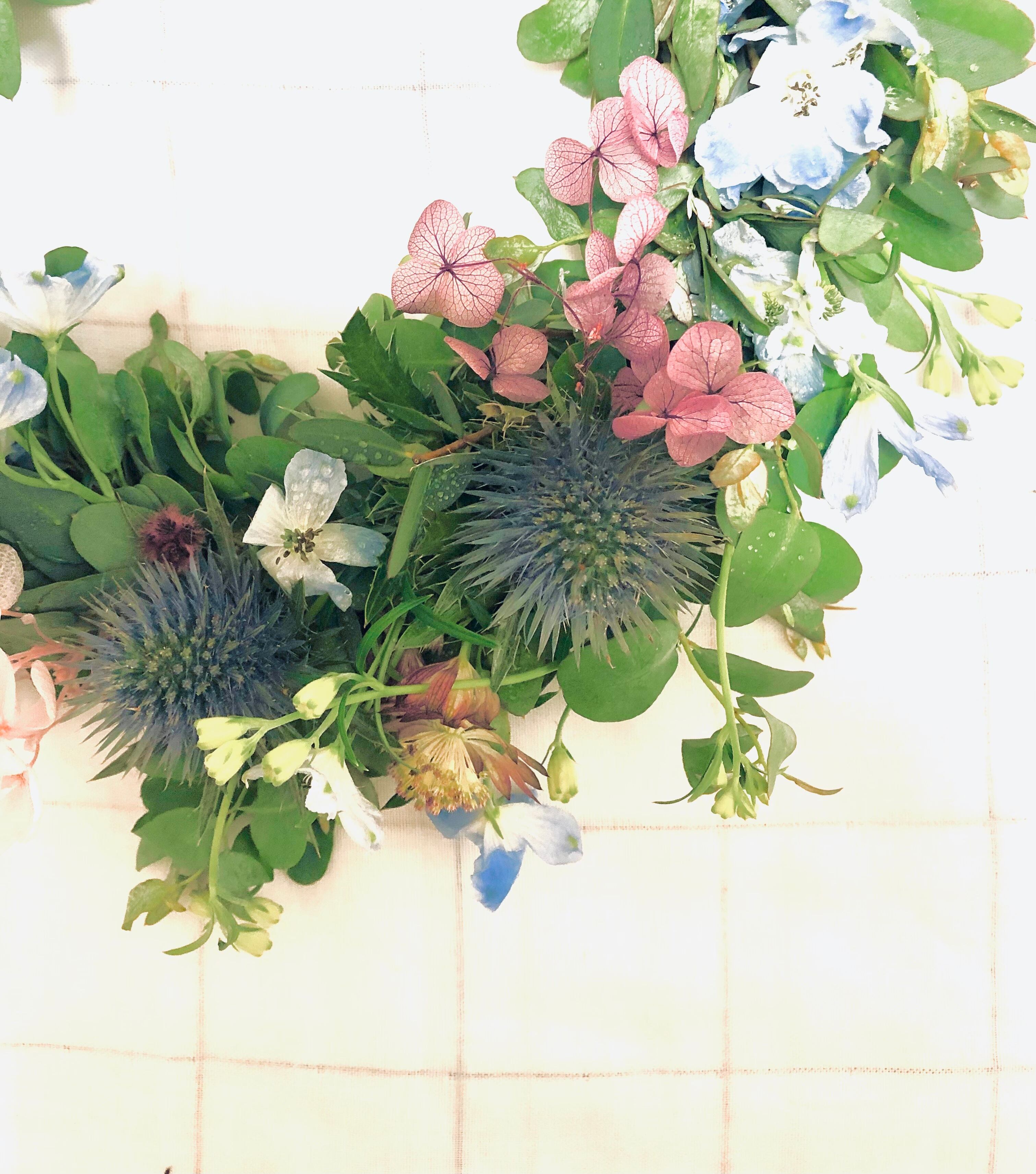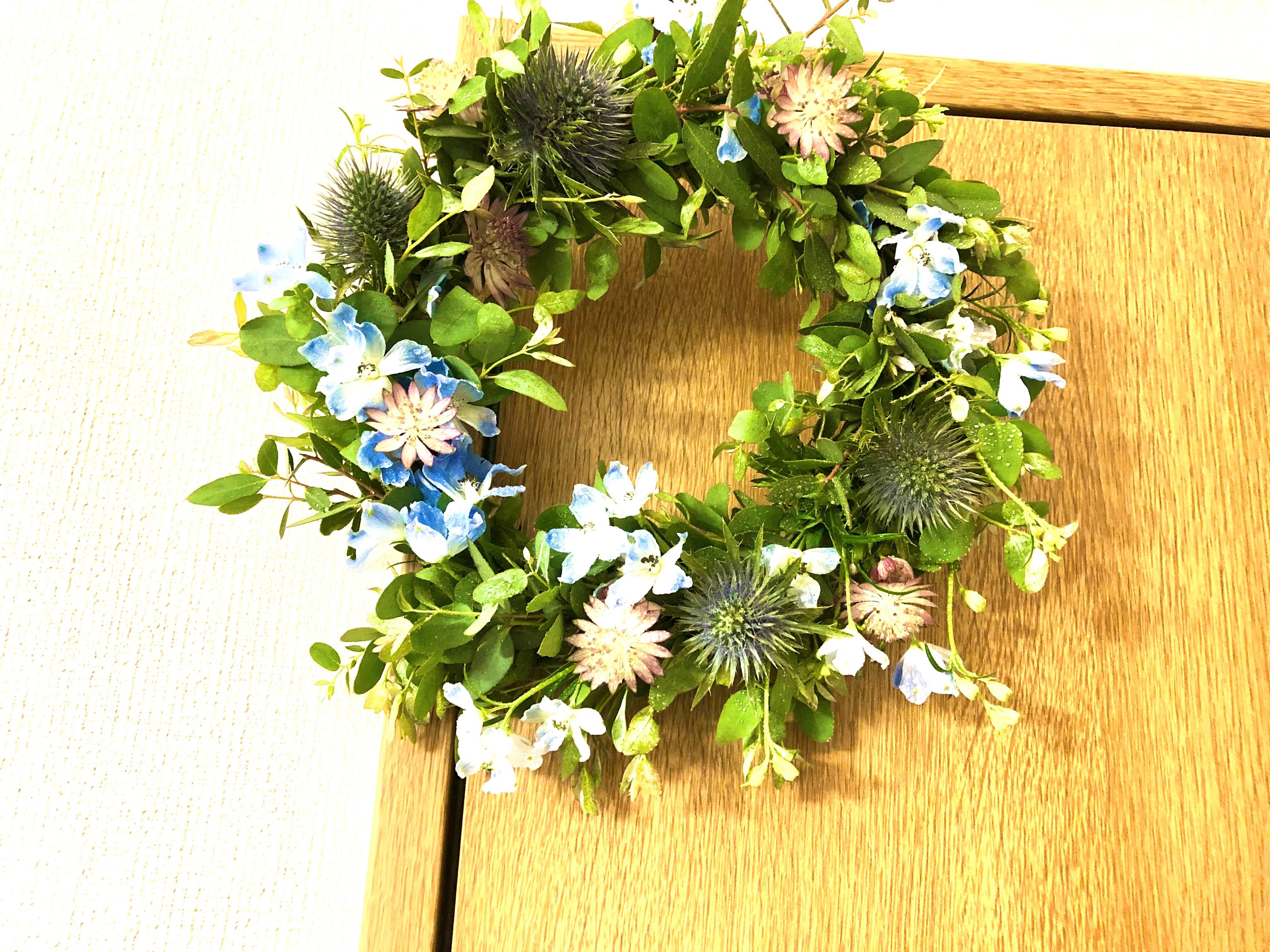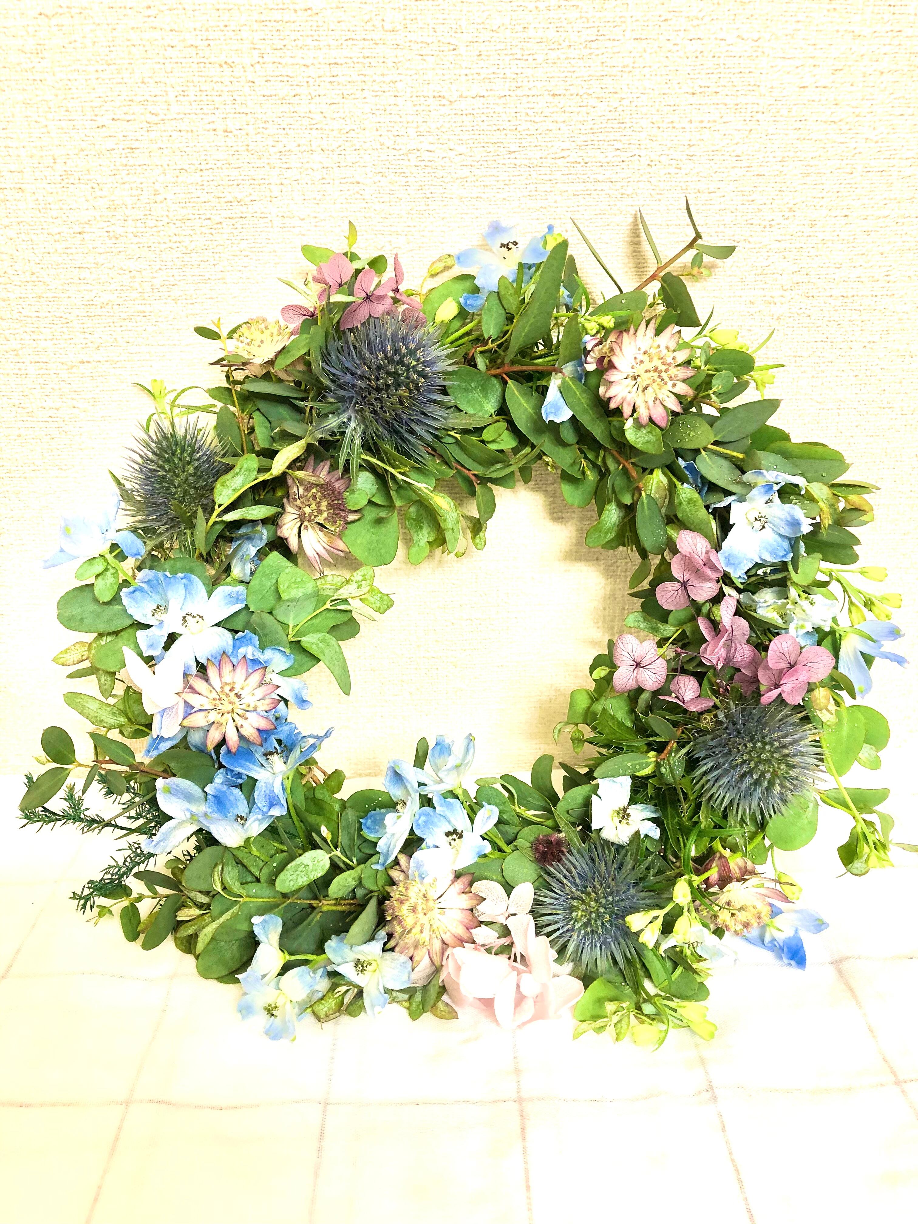 フレッシュなシルバーグリーンのユーカリをメインに、エリンジウムやアストランティア、デルフィニウムをあわせ、夏向けのリースをお作りいたしました。ユーカリをたっぷり使っておりドライになってもボリュームはのこります。ドライになっても綺麗な花材をセレクトして仕上げました。作りたての画像の状態はフレッシュですが日毎にドライ化していきます。ドライになる様子も楽しんで頂けます。受注制作商品ですのでお受け取りの際はフレッシュに近い状態です。フレッシュリースを飾って夏のおうち時間を楽まれてみては…⌘ ⌘ ⌘