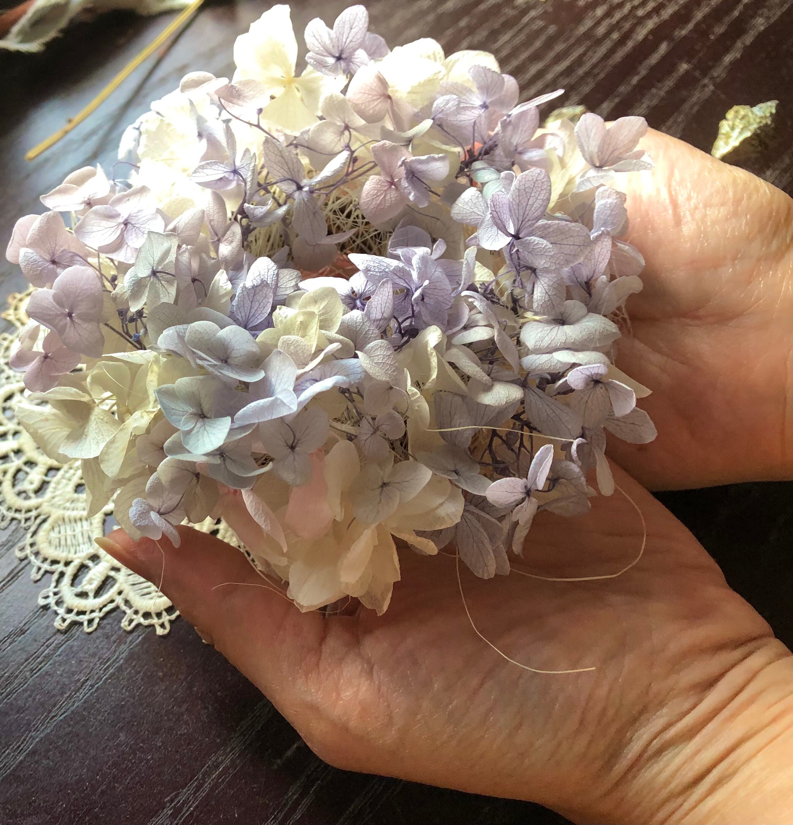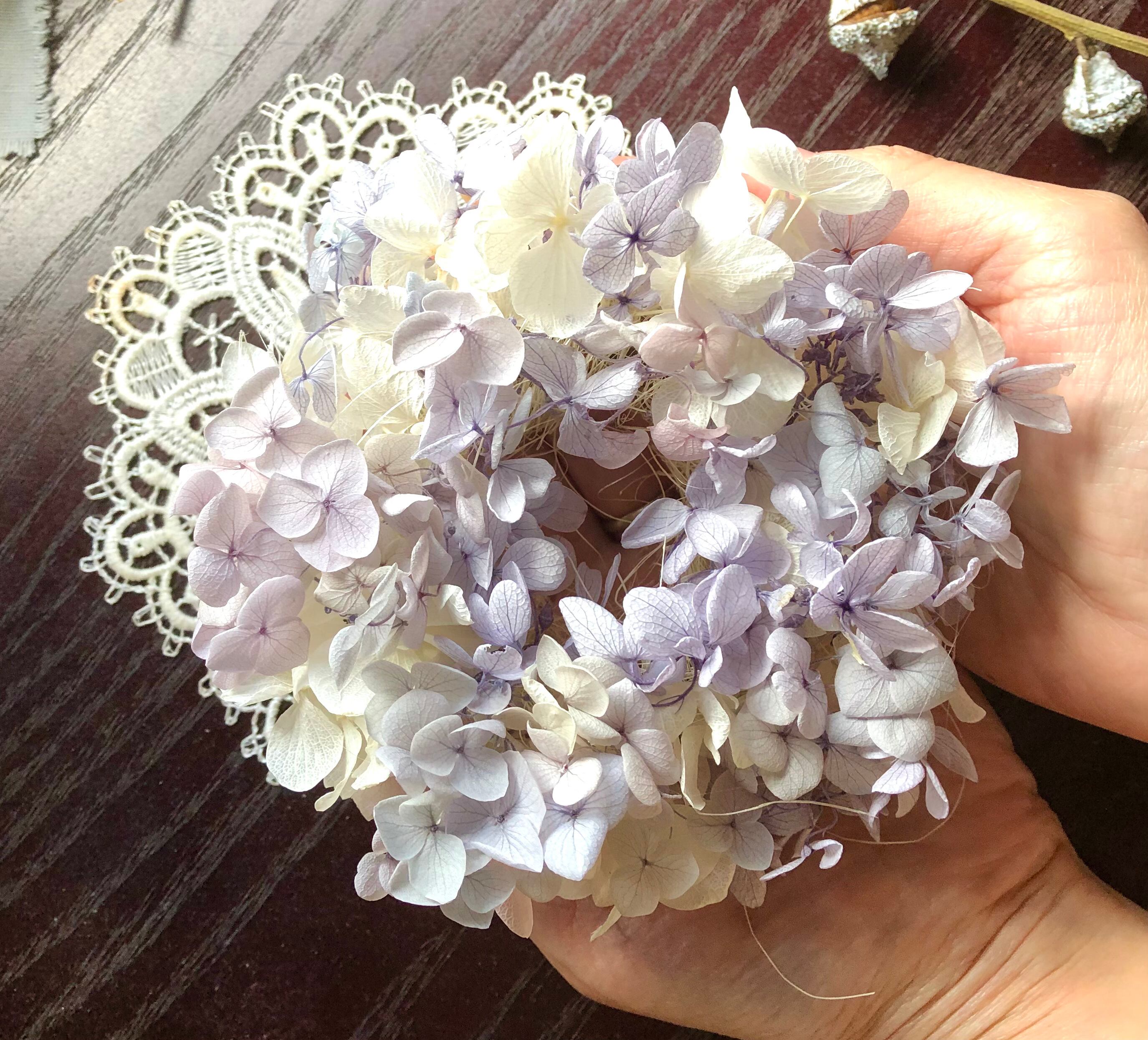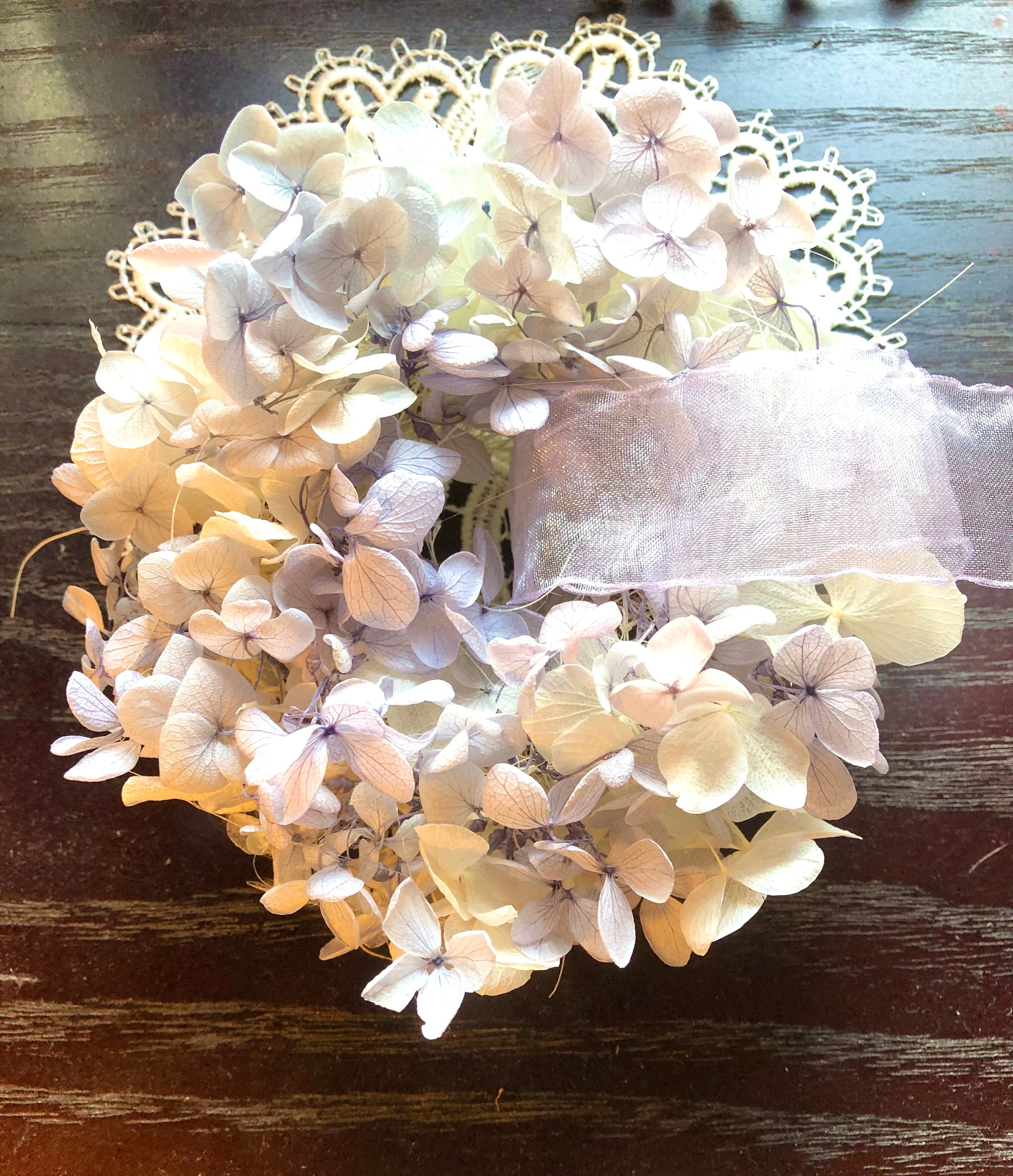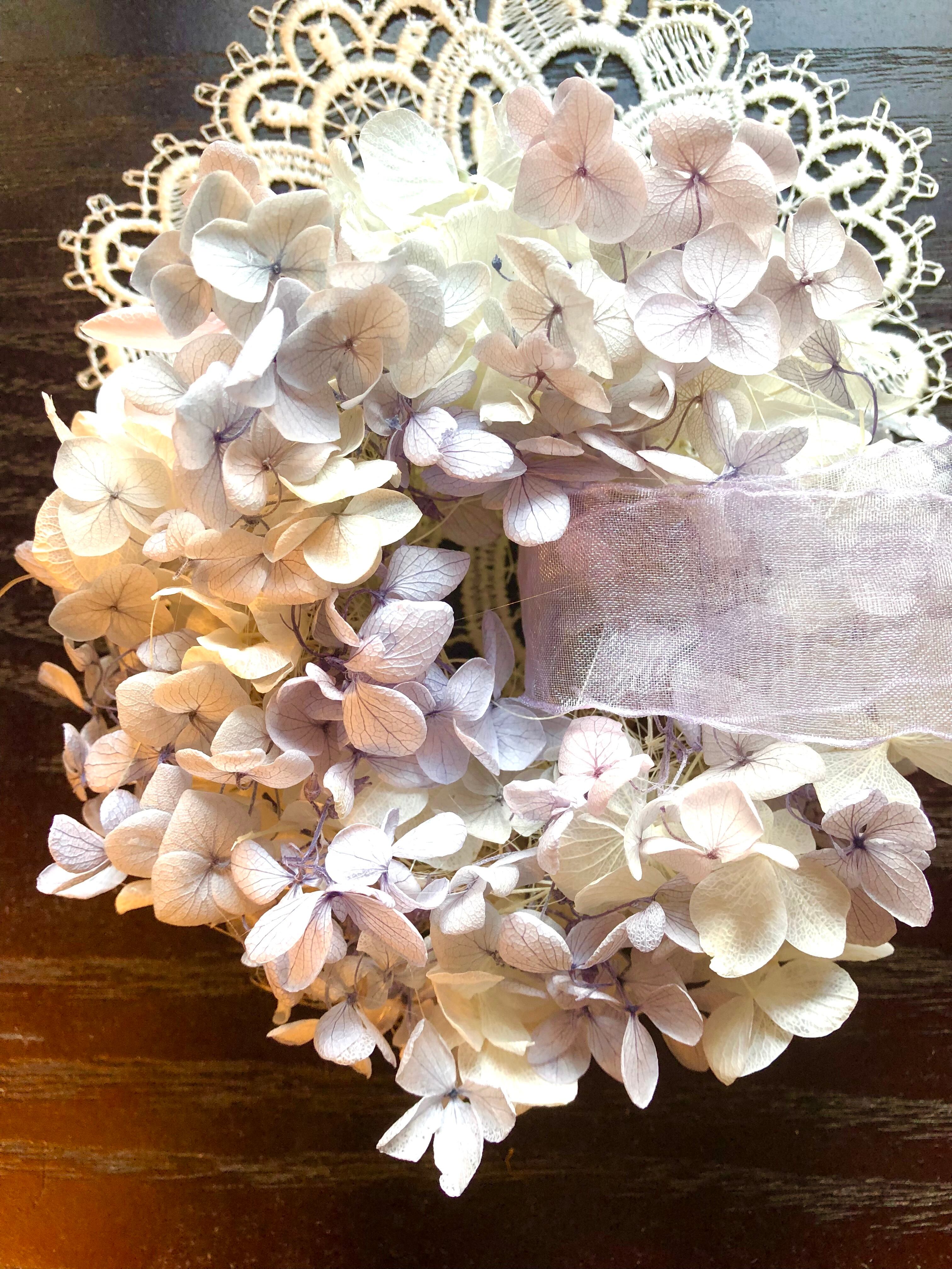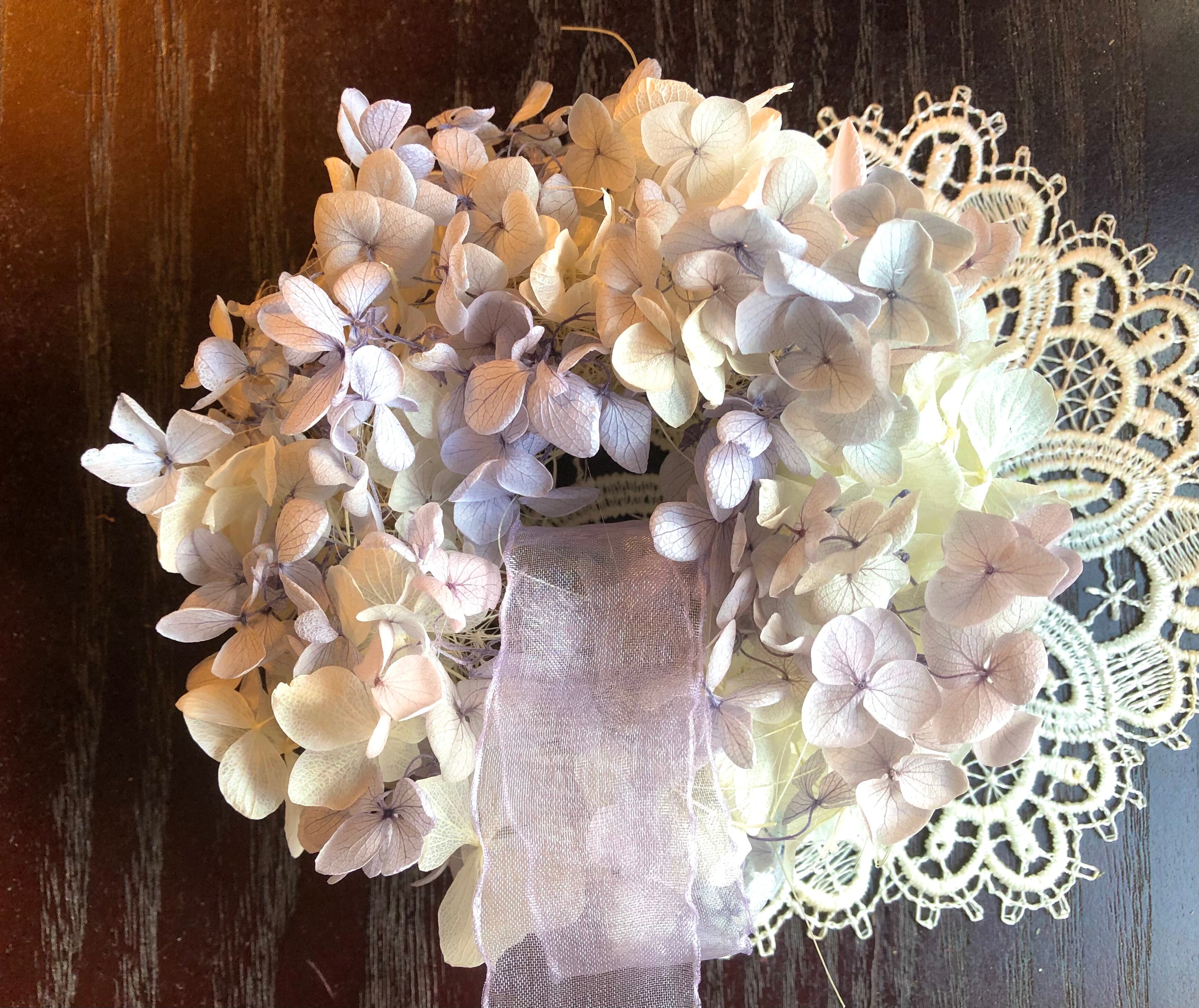 繊細なラベンダー色のグラデーションのプリザーブドフラワーのあじさいでミニリースを作りました。